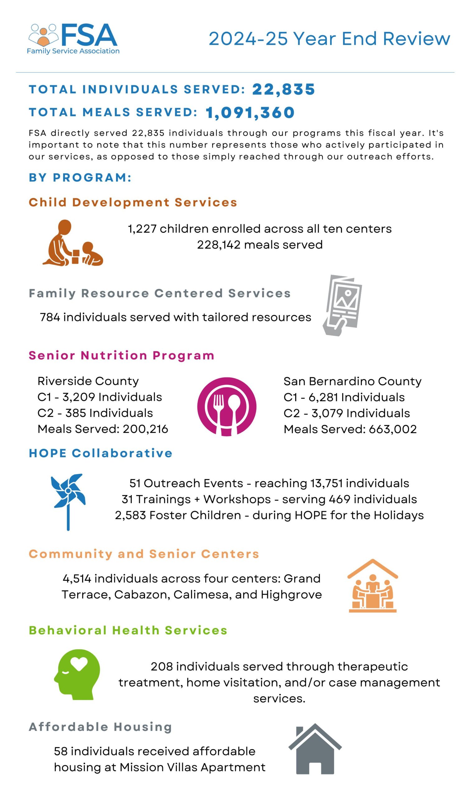 Every year, FSA helps thousands of individuals and families build healthier, more stable lives. Through programs in nutrition, childcare, behavioral health, housing, and family support, we create meaningful, lasting change across Riverside and San Bernardino Counties.