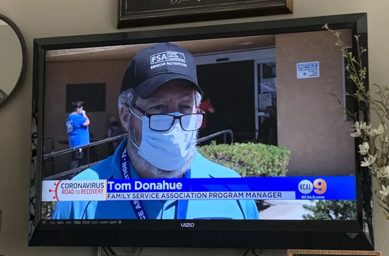 FSA’s Tom Donahue, Senior Nutrition Program Administrator interviewing with KCAL 9 News in San Jacinto Community Center, regarding SoCal Gas Fueling Our Community Partnership.